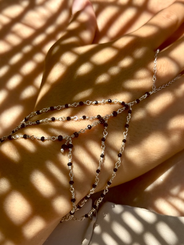Stylish Faceted Jet-Black Faceted Onyx handchain crafted with 925 Sterling Silver. Onyx is known for strength, grounding, and protection—and of course, since black goes with everything you can wear it all the time. Fits wrist 6″ – 7″ – Tailored sizing available.
